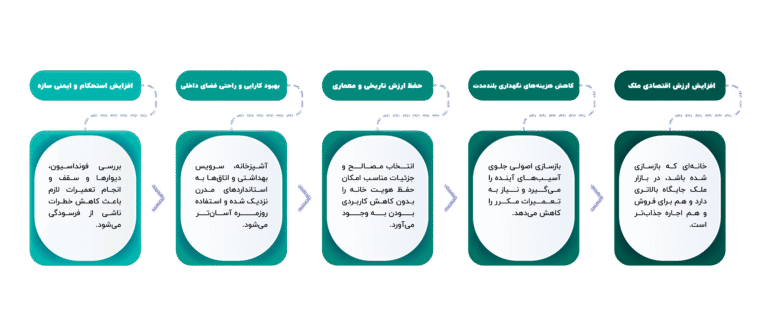 - افزایش استحکام و ایمنی سازه: بررسی فونداسیون، دیوارها و سقف و انجام تعمیرات لازم باعث کاهش خطرات ناشی از فرسودگی میشود