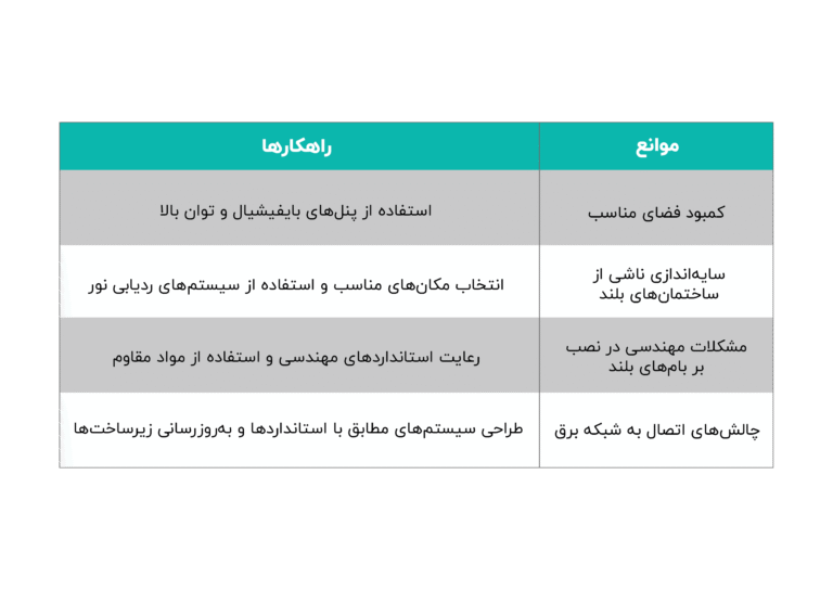 جدول موانع و راهکارهای نصب پنل خورشیدی در شهر